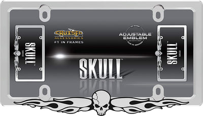 Cruiser Accessories Skull Chrome license plate frame features a two-dimensional skull and flames emblem which can be displayed at the top or bottom of the frame.