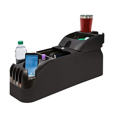 Fits on the floor or seat of most cars, trucks, vans or SUV’s. Designed as a mid-range console with built in coin slots and multiple storage areas for phones, CD’s, GPS, and sunglasses. Two deep multi sized cup holders. Manufactured in the USA to the highest quality standards from durable plastic resins.