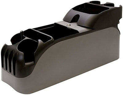 Fits on the floor or seat of most cars, trucks, vans or SUV’s. Designed as a mid-range console with built in coin slots and multiple storage areas for phones, CD’s, GPS, and sunglasses. Two deep multi sized cup holders. Manufactured in the USA to the highest quality standards from durable plastic resins.