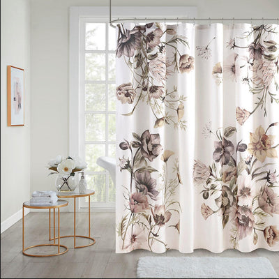 Made from 100% cotton percale, this shower curtain features a large floral print in soft blush hues on an ivory ground to create a gorgeous and unique design. With a soft and romantic color combination, this shabby chic shower curtain is the perfect touch to flourish any decor and bathroom. Machine washable for easy care, this shower curtain is also OEKO-TEX certified meaning it does not contain any harmful substances or chemicals to ensure quality comfort and wellness. Each shower curtain measure 72"x72" and is finished with 12 button holes at the top making it easy to hang; hooks, rod, and a water repellant liner are not included and will need to be purchased separately. Complete the look with coordinating bedding, available and sold separately.