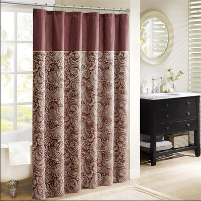 The burgundy and gold in this curtain make it easy to coordinate with your towels and accessories.