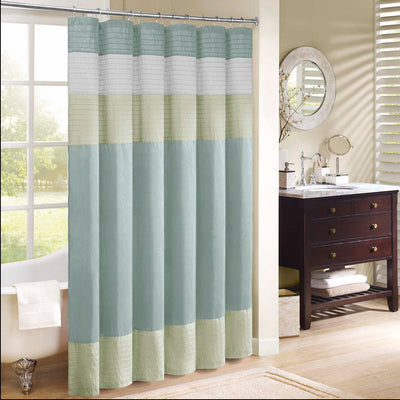 The faux silk dupioni fabric has a natural light sheen and drapes beautifully, while also machine washable for easy care. This lightweight shower curtain features pieced and pintucking details creating a rich texture and a unique color block design, sure to freshen up any space. Pattern layout may vary due to variation of sizes. A water repellant liner is not included, and highly recommended. Complete the collection and look with coordinate bath decor, bedding, and window decor - available and sold separately.