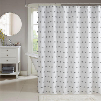 The solid white background features rows of soft grey fabric pom poms, adding beautiful texture and a stylish update to any bathroom. Machine Washable for easy care; Each shower curtain measure 72"x72" and is finished with 12 button holes at the top making it easy to hang; hooks, rod, and a water repellant liner are not included and will need to be purchased separately.