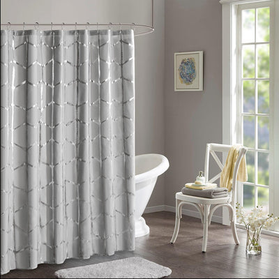 FEATURES‚ Modern contemporary metallic print shower curtain‚ Lightweight shower curtain for airy look and feel‚ Geometric metallic print that brightens your bathroom decor‚ Shower curtain 72x72 inches, 12 button holes‚ Coordinating comforter set or duvet set sold separately‚ Machine washable for easy care