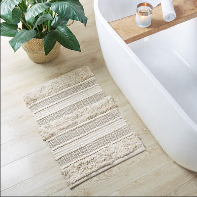 Bath Rug is the perfect update to refresh your bathroom decor. This hand-woven bath rug features a combination of beautiful patterns, shaggy textures, and fabric techniques in a vertical stripe layout, for a stylish Boho look and feel. The shaggy woven texture is featured in a solid light natural hue, which alternates between a grey geo pattern and fabric manipulation technique to create soft dimension and a unique design. Machine washable for easy care; this rug is also finished with a Non-skid resistance latex backing to help keep the rug in place throughout the day. Complete the look of this New INK+IVY bath rug collection with any of our coordinating INK+IVY Shower Curtain, Bedding, and Window Collections, available and sold separately.