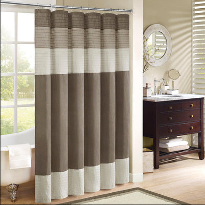 FEATURES‚ Faux silk lightweight dupioni fabric shower curtain in 72x72 inches‚ Pieced and pintucking detailing for unique texture and colorblock design‚ Light sheen from faux silk fabric‚ Machine washable for easy care‚ Water repellant liner is not included‚ Coordinate bath decor, bedding, and window decor available and sold separately