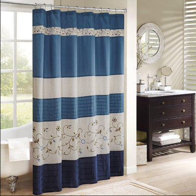 Home Outfitters Navy Faux Silk Lined Shower Curtain w/Embroidery 72x72", Shower Curtain for Bathrooms, Transitional