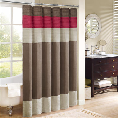 The faux silk dupioni fabric has a natural light sheen and drapes beautifully, while also machine washable for easy care. This lightweight shower curtain features pieced and pintucking details creating a rich texture and a unique color block design, sure to freshen up any space. Pattern layout may vary due to variation of sizes. A water repellant liner is not included, and highly recommended. Complete the collection and look with coordinate bath decor, bedding, and window decor - available and sold separately.
