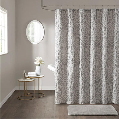 This luxurious textured shower curtain flaunts a gorgeous silver damask medallion design on a stria grey jacquard ground that adds rich texture and dimension to the lavish look. Measuring 72x72", each shower curtain is finished with 12 button holes on top making it easy to assemble hooks and hang onto rod (hooks and rod not included). To better preserve this beautiful shower curtain, a water repellant liner is highly recommended and can be purchased separately (liner not included). Machine washable for easy care; complete the collection with coordinate matching bedding, alas available and sold separately.