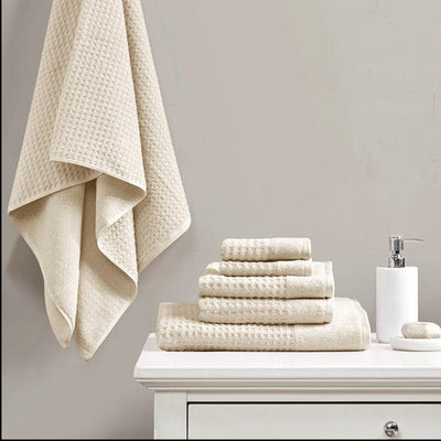 FEATURES‚ All over waffle jacquard combed cotton towel set in 600GSM weight‚ Towel is lightweight so it does not weigh down from moisture, quick dry‚ Dupont Silvadur anti-microbial treatment for health and wellness - provides odor control, prevents bacteria buildup, enhances hygiene, and extends product life by keeping linen fresher, longer. ‚ Oeko-Tex Certified, includes no harmful substances or chemicals (# ZHHO 058721)‚ Stylish velour dobby cuff for soft feel and added flair‚ Machine washable for easy care‚ Set includes: 2 bath (28x54), 2 hand (16x26), and 2 wash (12x12) towels