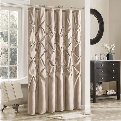 Its soft taupe color paired with large tufting creates a contemporary look while adding beautiful texture to your space. Made from 100% polyester polyoni, this semi-sheer shower curtain is lightweight with a nice soft sheen and machine washable for easy care. A water repellant liner is not included and highly recommended. Complete the collection with coordinate bedding, available and sold separately.
