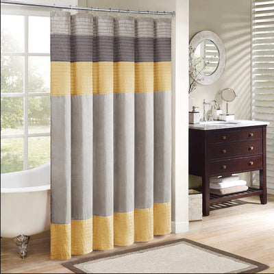 FEATURES‚ Faux silk lightweight dupioni fabric shower curtain in 72x72 inches‚ Pieced and pintucking detailing for unique texture and colorblock design‚ Light sheen from faux silk fabric‚ Machine washable for easy care‚ Water repellant liner is not included‚ Coordinate bath decor, bedding, and window decor available and sold separately