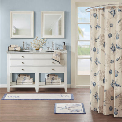 Rug adds the perfect coastal touch to your bathroom decor. Made from 100% cotton, this tufted rug features fun shell and seaside designs in lush blue and taupe hues, for a warm and inviting look. The cut and loop pile technique creates a soft textured feel to provide you with the utmost comfort. Machine washable for easy care, this cotton tufted rug offers the perfect accent for your beach retreat. Complete the collection with coordinate shower curtain and towels, available and sold separately.