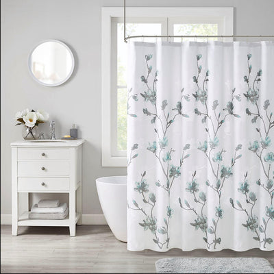 FEATURES‚ Shabby chic light weight shower curtain in floral burnout and liner 72x72 inches‚ Microfiber liner added to provide better privacy and drapability ‚ Select various colorways that best matches your bathroom decor‚ Machine washable for easy care