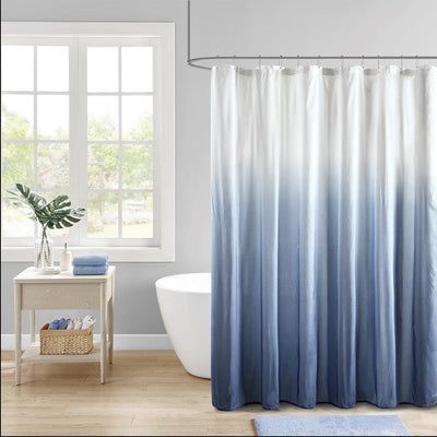 This shower curtain features a blue ombre print on an embossed seersucker fabric, for a contemporary look that’s rich in texture. The lightest color of the ombre design starts at the top and gradients to a darker color towards the bottom for a naturally soothing look. Machine washable for easy care, this contemporary shower curtain measures 72"x72" and is easy to hang with the 12 button holes at the top. A water repellant liner is not included, and highly recommended for the utmost protection.