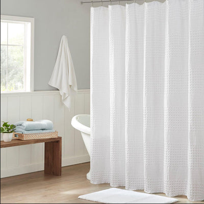 This solid White shower curtain features a heavy waffle weave base fabric that creates a rich texture for a simple and stylish update. The medium weight fabric allows a natural and rich drapability, while the 100% cotton provides the perfect natural touch. Each shower curtain is machine washable for easy care and finished with 12 button holes at the top, making it easy to attach hooks and hang on rod (hooks and rod not included). A water repellant liner is not included, but highly recommended to ensure the best care and handling of this rich medium weight shower curtain. Coordinates perfectly with the Madison Park 800 GSM Bath Towel Collection.