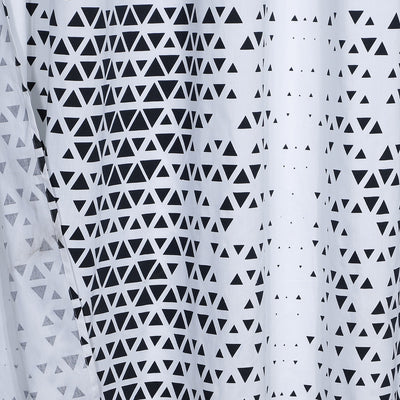 Set an undeniably modern and chic tone into your contemporary bathroom space with this eye-catching Navy and White Geometric Illusion Shower Curtain. The eclectic geometric triangles in navy are skillfully repeated over a frosty-white base to create an optical illusion that allures the gaze. For optimum durability and easy cleaning, this shower curtain is constructed with 100% premium cotton fabric that feels soft on the touch and looks visually luxurious. With beautifully crafted reinforced buttonholes, this curtain is easy to hang on a curved, tension, or stall rod with the help of curtain hooks, clips, or rings. This curtain will provide privacy in your bathroom space and allow you to enjoy a spa-like experience in the comfort of your own home. Pairing it with a matching liner will contain water in the tub and keep the floors dry while retaining moisture in the shower area. The fascinating print and soft fabric of this shower curtain will perfectly harmonize with a wide variety of bathroom styles and decors. 70Ó x 72Ó
