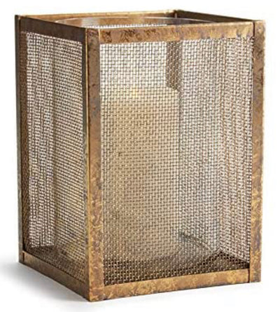 A light-catching mesh screen in antique gold adds a hint of drama. Complete with glass vases, not hurricanes so as to hold fresh florals as well as candles.
