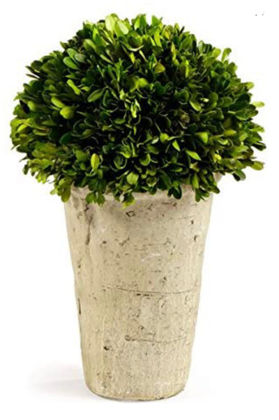 Preserved boxwood three quarter ball in tom pot. Preserved greens are real English boxwoods, preserved and painstakingly assembled by skilled topiary artists. The leaves are remarkable subtle to the touch, the color is an intensely rich green that rivals living boxwood in nature. This little 3/4 ball sits perfectly on top of the tall tom pot in rustic ceramic finish. Put a pair of them on your mantle, add one to your guest bathroom, dress up your kitchen counter with this little gem. Green thumbs not required tm interior use only. Keep away from direct sunlight to help minimize fading. Lightly mist with water in dry arid environments. Excessive misting, humidity and moisture may cause mold and mildew . Avoid dark damp humid conditions. Use the pot supplied or place the topiary in of our your favorites pots.