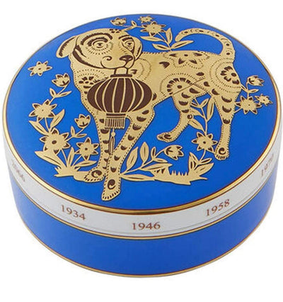 Golden Large Round Box Dog from Vista Alegre. Elegant and functional, the pieces of the Golden collection features the symbols of the ancient Chinese zodiac, represented by twelve animals, real and imaginary. The Golden collection enhances these qualities with numerous engraved and gold-painted details, reminiscent of traditional Chinese designs. The pieces make a statement for both their artistic character and delicate mysticism.