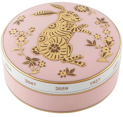 Golden Large Round Box Rabbit from Vista Alegre. Elegant and functional, the pieces of the Golden collection features the symbols of the ancient Chinese zodiac, represented by twelve animals, real and imaginary. The Golden collection enhances these qualities with numerous engraved and gold-painted details, reminiscent of traditional Chinese designs. The pieces make a statement for both their artistic character and delicate mysticism.