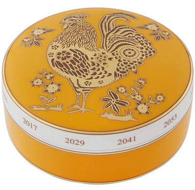Golden Large Round Box Rooster from Vista Alegre. Elegant and functional, the pieces of the Golden collection features the symbols of the ancient Chinese zodiac, represented by twelve animals, real and imaginary. The Golden collection enhances these qualities with numerous engraved and gold-painted details, reminiscent of traditional Chinese designs. The pieces make a statement for both their artistic character and delicate mysticism.