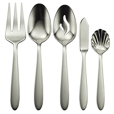 - Also includes a serving spoon, pierced serving spoon, meat fork, butter knife, and sugar spoon