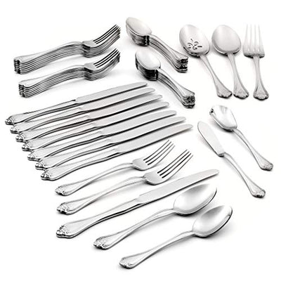 - 20-piece flatware set with service for 4: Set includes 4 each: salad fork, dinner fork, dinner knife, dinner spoon and teaspoon