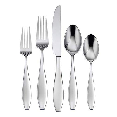 - 20-piece flatware set with service for 4. Set includes 4 each: place knife, place fork, place spoon, salad/dessert fork, and teaspoon