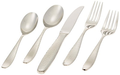 The Reed and Barton Palmer flatware set has a contemporary silhouette with updated hammered texturing and a bright finish. The high quality 18/10 stainless steel set is dinner sized and includes five essential serving pieces. The set is dishwasher safe and has a lifetime warranty.