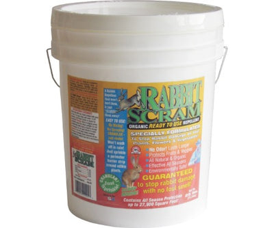 Rabbit Scram Rabbit Repellent is granular, organic, biodegradable and environmentally safe. Guaranteed to keep rabbits away. Won't harm animals, the environment and humans. Blended from selected organic components, it will keep rabbits off your plantings because it convinces rabbits that harm is nearby through their uncanny sense of smell. Will change rabbit behavior. Apply as a direct barrier repellent, protective perimeter strip or evenly spread over a garden bed or flowerbed. Will shield your flowers, shrubs, trees, ornamentals, vegetable gardens, forests, vineyards, orchards, field crops and nursery stock when used as directed and consistently applied every 30-45 days.