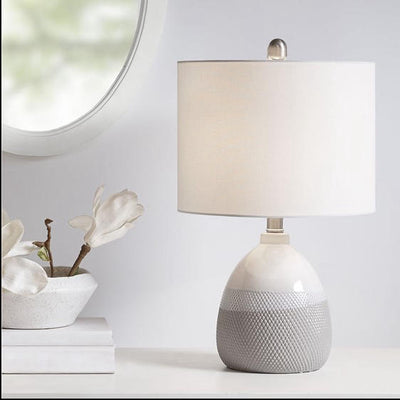 The base is made from ceramic with a painted Beige and white finish for a sleek gradient look. The drum shaped white shade softly filters the light, while also beautifully complementing the striking look. This table lamp is easy to incorporate into your existing space and perfect for accenting any living room or bedroom. One Type A light bulb is needed. Comes with a 2-year warranty.