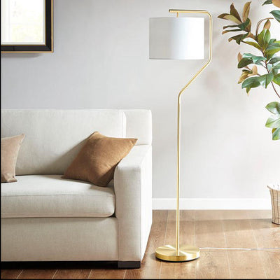 Featuring a slender, angular metal stand and gold base, this floor lamp comes with a linen drum-shaped shade that filters the light for a soft warm glow. A clear cord rounds out the simple transitional design to easily complement and illuminate your space. Uses 1, 60 Watt Type A light bulb (not included).