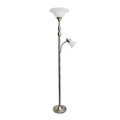 - Style: Traditional. Finish/Color: Antique Brass/White Shades. Primary Material: Metal. 75% Iron, 20% Glass, 5% Others. Base Type: . E26 Medium Base. Base Dimensions: base diameter: 10.5" Height: 66.5". Height from Base to Shade: Main 67". Reading 43.5". Bulb Included: . No