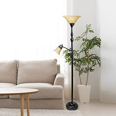 Torchiere Floor Lamp with Reading Light and Marble Glass Shades, Restoration Bronze and Amber