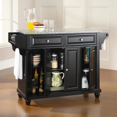 The Cambridge Full-Size Kitchen Island adds enduring style and storage to your kitchen. Featuring three cabinets, each with an adjustable shelf, this island can easily store pots, pans, and small appliances. Two large drawers keep small items like utensils and dishtowels close at hand, while the built-in spice rack and paper towel holder keep your counter space free of clutter. With a beautiful granite countertop and classic turned feet, the Cambridge Full-Size Kitchen Island is a welcome addition to your kitchen space.
