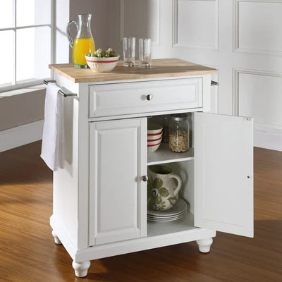 Save valuable space with the Cambridge Compact Kitchen Island. Featuring a large cabinet with an adjustable shelf, this island can easily store pots, pans, or small appliances. The large drawer will keep small items like utensils and dishtowels close at hand, while the towel bars on either side can be used for added hanging storage. With a beautiful wood countertop and classic turned feet, the Cambridge Compact Kitchen Island is a welcome addition to your kitchen space.