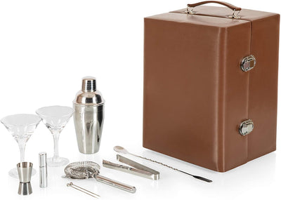 From the Roaring 20s to the 2020s, the Manhattan Portable Cocktail Set brings all that jazz back to happy hour. This complete bartender set is reminiscent of a vintage suitcase with its premium leatherette exterior and fully-insulated interior lined in sleek black velveteen which tastefully showcases your two favorite wine or liquor bottles and the included: two hand-blown 7oz. Martini glasses, stainless steel shaker, stainless steel double-sided jigger, stainless steel ice tongs, stainless steel strainer, two stainless steel olive picks, Vermouth mister, and elegant combination fork/spoon stirrer. This martini set is a handsome fixture on your home bar, or take your inner mixologist on the road, to the picnic, or on the train. Wherever you go, you'll be fabulous, dahling!