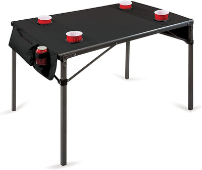 This Travel Table by Oniva, a Picnic Time brand, features a portable, folding soft-top design with durable polyester construction on a powder-coated steel frame. Perfect for the game room, camping, tailgating, or as a card table, it seats four comfortably and includes four sunken mesh cup holders in the tabletop, plus two more drink pockets- one on each end. The two zippered security pockets add storage to house your personal items such as cell phones, keys and wallets. Our Travel Table comes equipped with matching drawstring carry bag for easy transport and storage. When open, the table measures 42-1/2 inches long by 27-1/2 wide by 27-1/2 high. Fold it up to a compact 5-1/2 inches wide by 42-1/2 long and store it in its carry bag. Backed by the Picnic Time Family of Brands BUILT TO LAST Lifetime Guarantee.