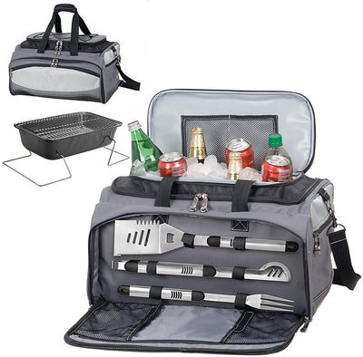The Buccaneer is a Picnic Time original design and the ultimate tailgating cooler and barbecue set in one! Don't be fooled by other similar looking items on the market. Only Picnic Time's Buccaneer features a PVC cooler that conveniently nests inside the compartment that houses the portable BBQ. The tote can carry the BBQ and a fully-loaded cooler at the same time! This patented, innovative design features a large insulated and fully-removable, water-resistant cooler that measures 16 x 8 x 7" and holds up to 24 12-oz soda cans. Unzip the cooler from the main tote to access the portable charcoal barbecue grill that's included. The cooler has two carry straps on either side, and features a mesh pocket on the interior lid that fits a large ice pack/gel pack. The Buccaneer also features an adjustable shoulder strap with comfort pad, a reinforced waterproof base, three large zippered exterior pockets to store personal effects, padded carry handles, and a stretch cargo cord on the top of the tote to carry a blanket or towel. Included in the tote are: 1 Combination storage bag and cooler tote, 1 fully-detachable cooler with handles, 1 portable charcoal BBQ grill with lid (16.7 x 10.8 x 5.1"), one black drawstring bag to hold the grill, and three stainless steel tools with aluminum handles and non-slip thumb grips: 1 large spatula featuring a built-in bottle opener, grill scraper, and serrated edge for cutting, 1 pair of tongs, and 1 BBQ fork. Don't be caught without the Buccaneer at your next tailgating party. Care Instructions:Surface wash tote with damp cloth only. Clean grill/tools with mild dishwashing detergent or baking soda or use a citrus-based degreaser and nylon scrubbing brush. The tote features an adjustable shoulder strap with comfort pad, a reinforced waterproof base, three large zippered exterior pockets to store personal effects, padded carry handles, and a stretch cargo cord on the top of the tote to carry a blanket or towel.