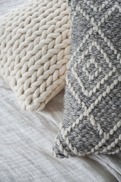 The Handwoven Braided White Pillow features a versatile white braided pattern that can be styled with any piece in the collection.