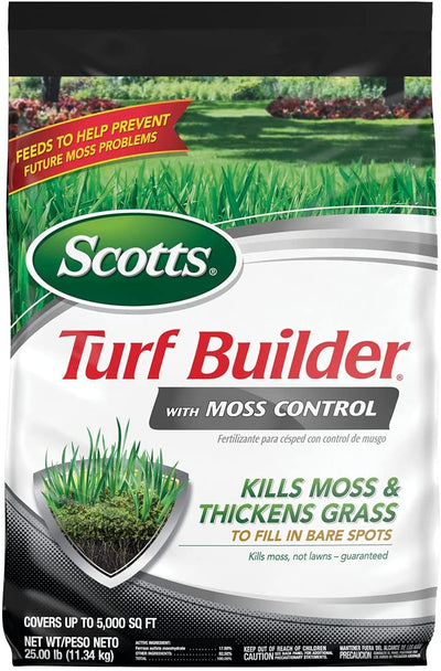 Scotts Turf Builder with Moss Control kills moss—. At the same time, it feeds your lawn, thickening grass to prevent any future moss problems. Apply Scotts Turf Builder with Moss Control wherever moss is actively growing, and say hello to a beautiful, green lawn!