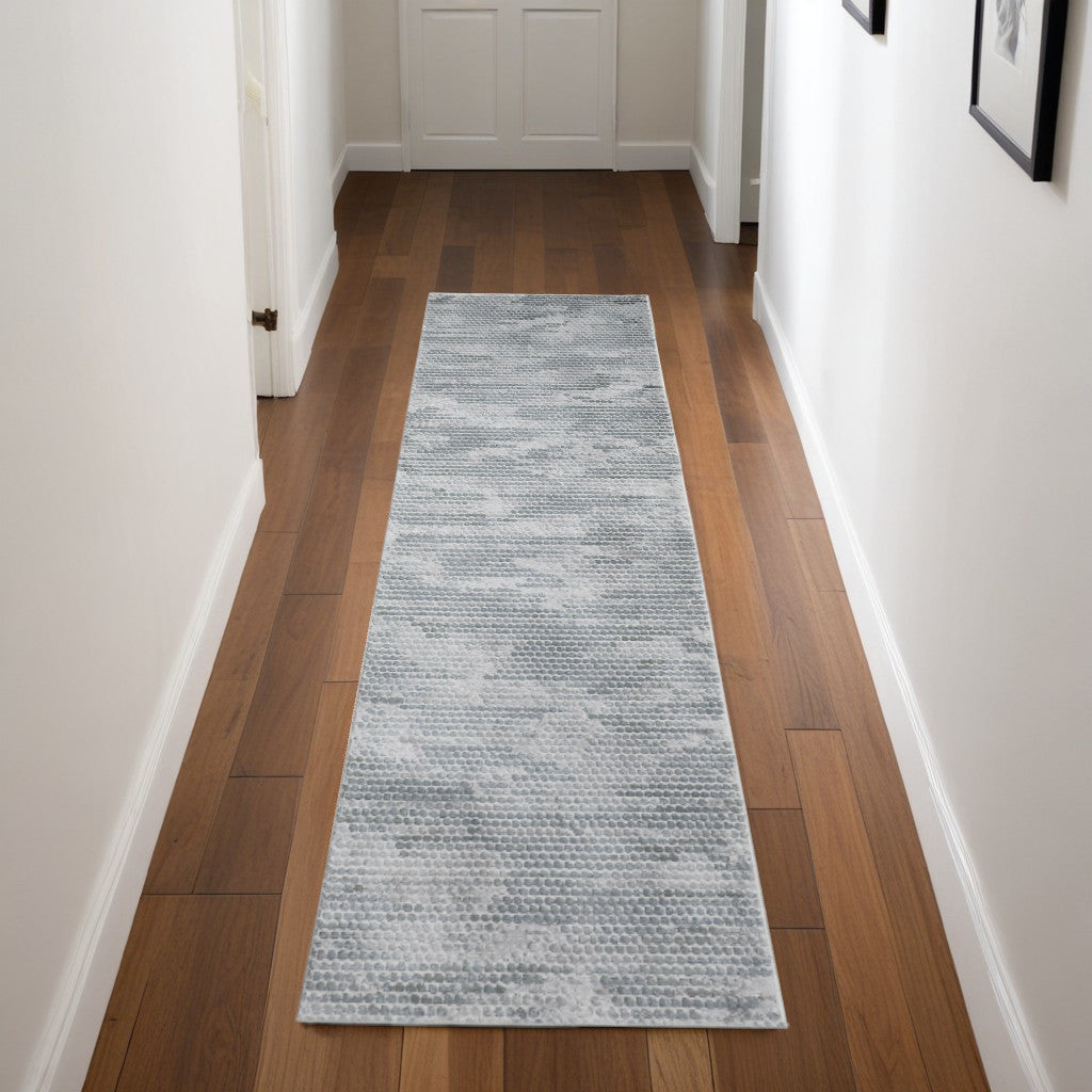 Set an inviting tone in your space with this 8-foot gray and blue abstract power loom runner rug. This runner shaped rug features a abstract design in gray and blue to give it visual interest. A classic shape marries with good looking design for your space ideal for spaces with kids and pets, this rug is stain resistant to help repel stains and spilled liquids. Area rugs help to give warmth and sense of home to your space. 32-inch H x 120-inch W x 0.43-inch D