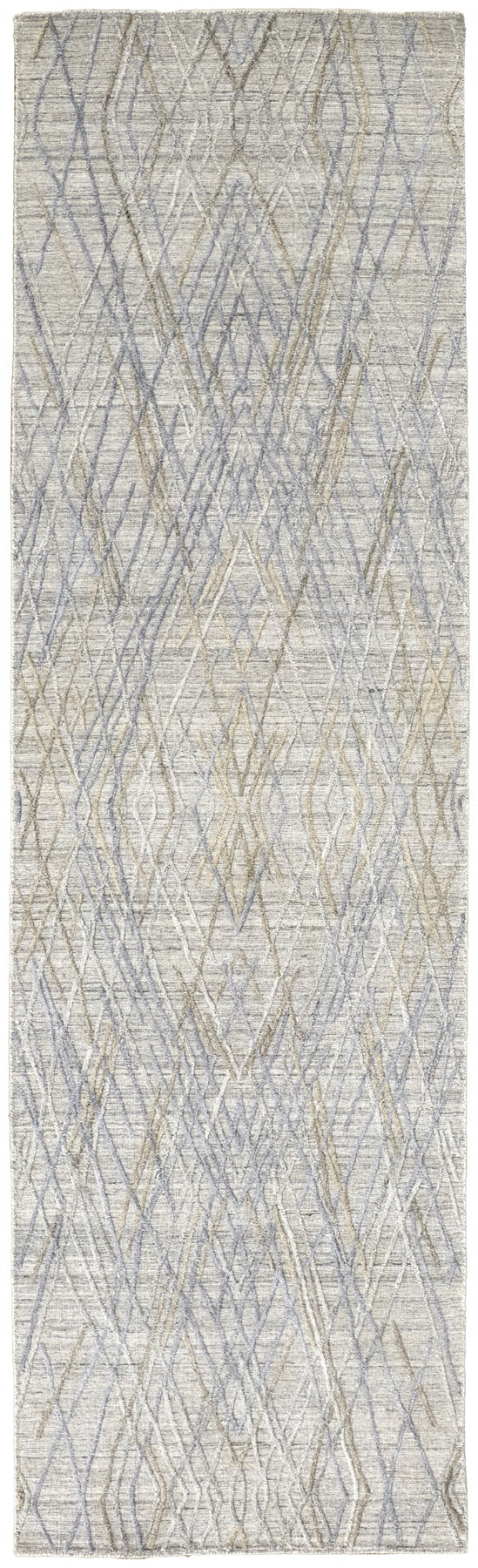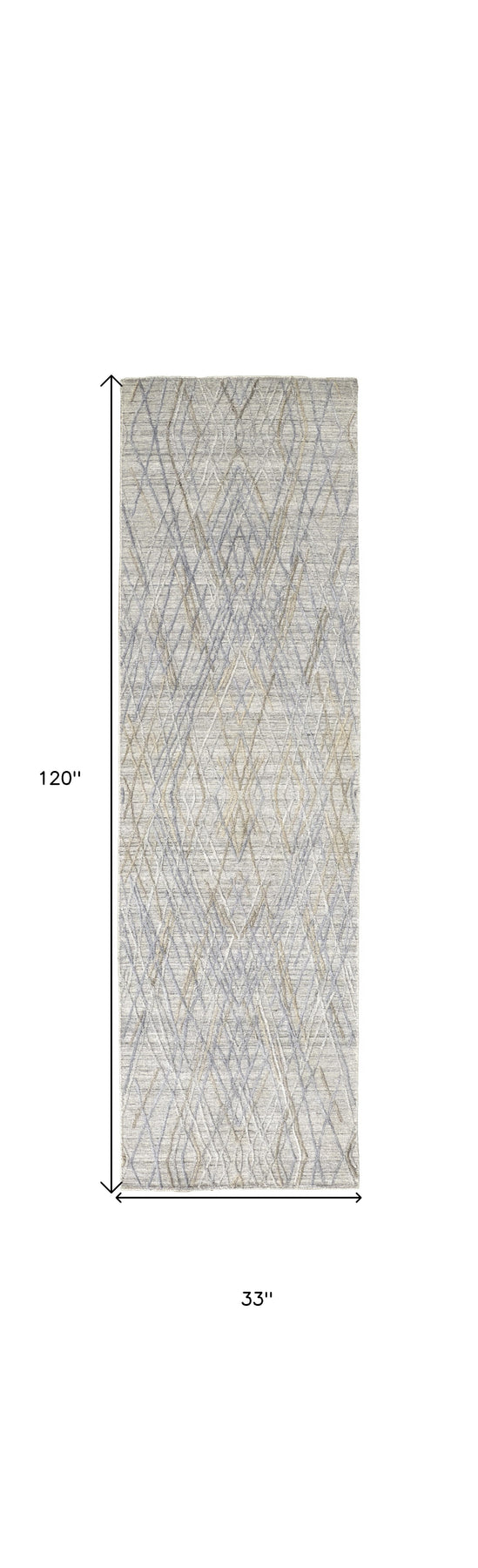 Add some artistry to your room with this 10-foot blue and gray abstract hand woven runner rug. This runner shaped rug features a abstract design in blue and gray to give it visual interest. A classic shape marries with good looking design for your space crafted by skilled artisans, this hand woven rug is genuine and unique. No two will be exactly alike. 33-inch H x 120-inch W x 0.4-inch D
