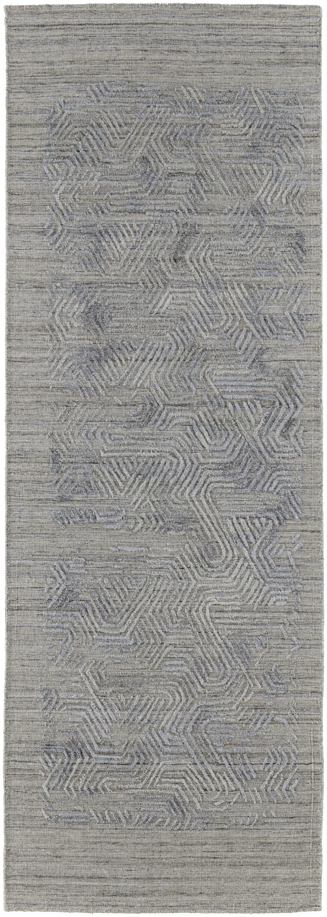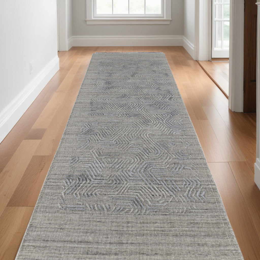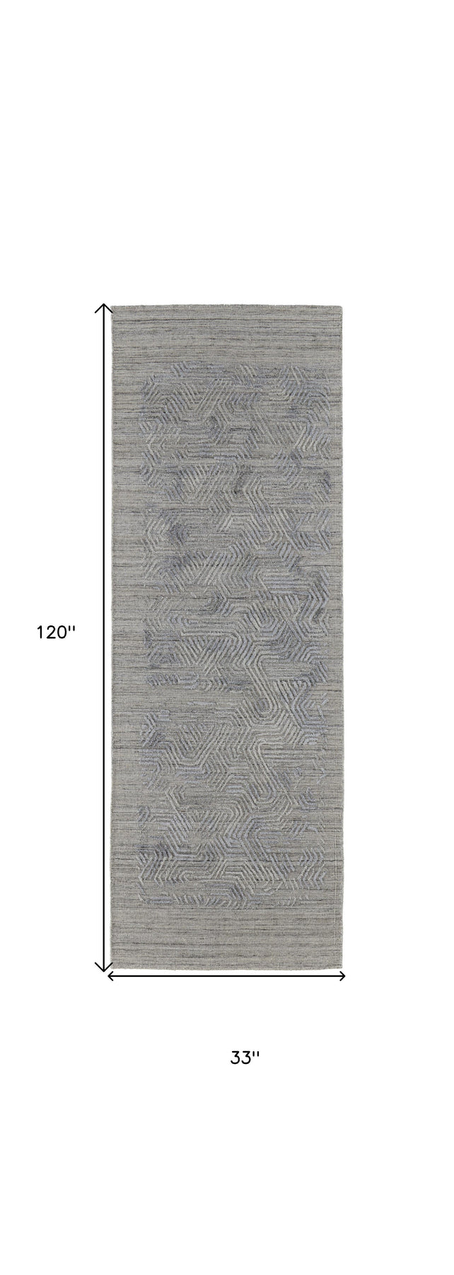 Add some artistry to your room with this 10-foot blue and gray abstract hand woven runner rug. This runner shaped rug features a abstract design in blue and gray to give it visual interest. A classic shape marries with good looking design for your space crafted by skilled artisans, this hand woven rug is genuine and unique. No two will be exactly alike. 33-inch H x 120-inch W x 0.4-inch D