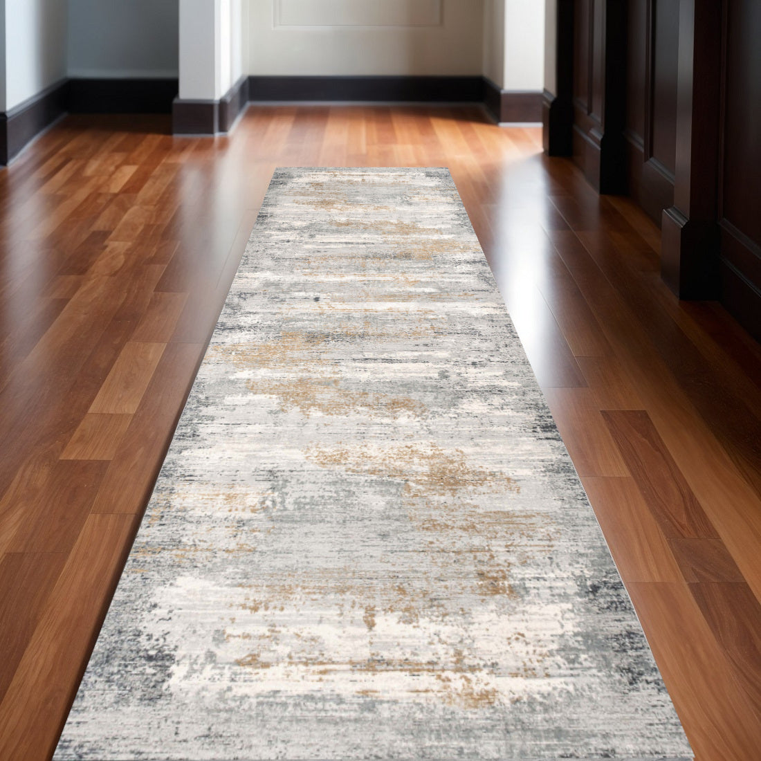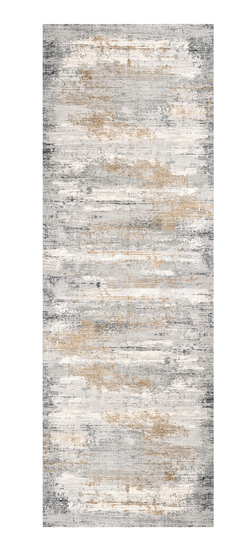 Encouraging imagination and creativity in the colors and patterns, this Gray Mod Distressed Strokes Runner Rug serves to set a mood in any modern or contemporary living space. The visually intriguing piece of abstract art in distressed shades of gray and ivory creates a stylish combination while the splashes of brown tints catch the eyes. Made in Turkey with a fusion of viscose and polyester in a low pile construction to make sure the immaculate look lasts for ages while being durable enough to withstand indoor elements. The soft and smooth surface texture not only offers a layer of warmth under the feet but also adds a silky sheen to the piece. Upholding a subtle sophistication in a neutral palette, this runner rug will add a dimension to your modern living space. 120Ó x 27Ó x 0.4Ó