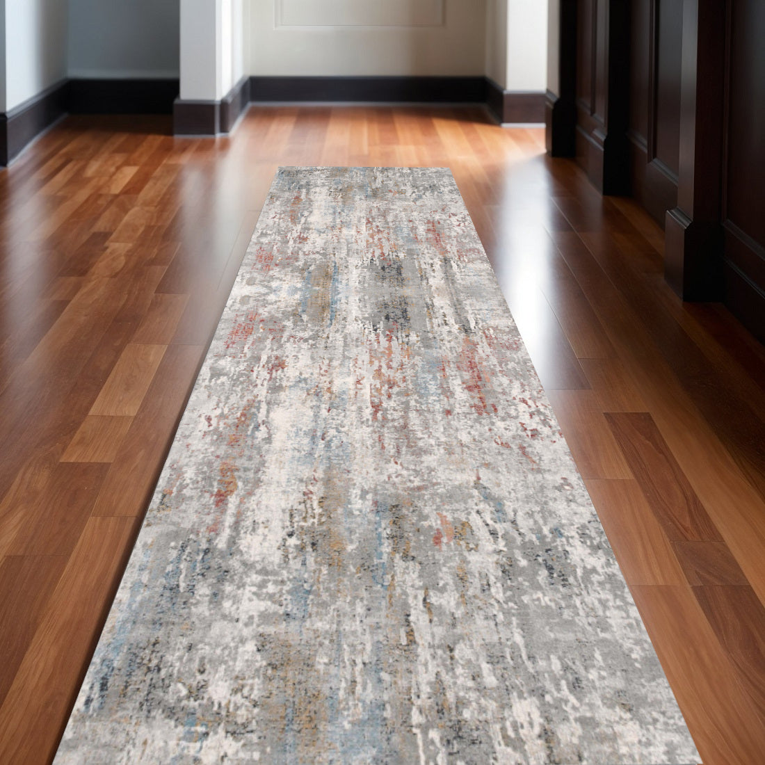 Showcasing an artistic expression in its abstract patterns, this Gray Abstract Pattern Runner Rug will complement the aesthetics of any contemporary living space. The skillful fusion of grays with hints of cinnamon resembling the splashes and spills of paints creates an intriguing weathered effect for visual appeal. Woven in Turkey with durability in mind, this rug features a mix of viscose and polyester fibers that give it a shimmering velvet look to enliven any area of your home. The low pile construction provides a rich surface texture for added comfort making it an ideal piece for indoor areas with high foot traffic while the serged edges give it a defined look. Simple and sophisticated in its neutral hues, this runner rug will seamlessly blend in with a range of modern or contemporary interior decors. 120Ó x 27Ó x 0.4Ó