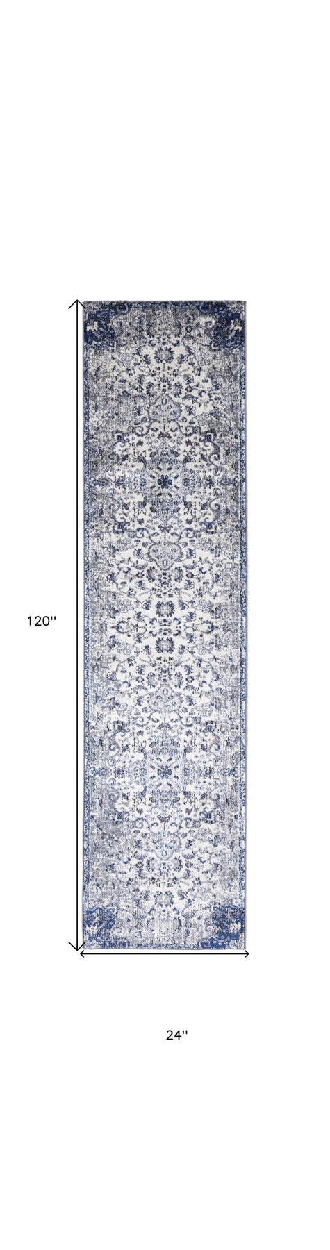 Add great coloration and comfortable texture to your space with this 10' ivory gray and blue floral power loom distressed stain resistant runner rug. This runner shaped rug features a floral design in ivory gray and blue to give it visual interest. A classic shape marries with good looking design for your space This superior Turkish rug represents the highest quality and is built to last. Ideal for spaces with kids and pets, this rug is stain resistant to help repel stains and spilled liquids. Place this area rug against a hardwood or tile floor and it will enliven your living space with style and sophistication. 0.39" H x 24" W x 120" D