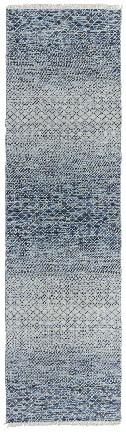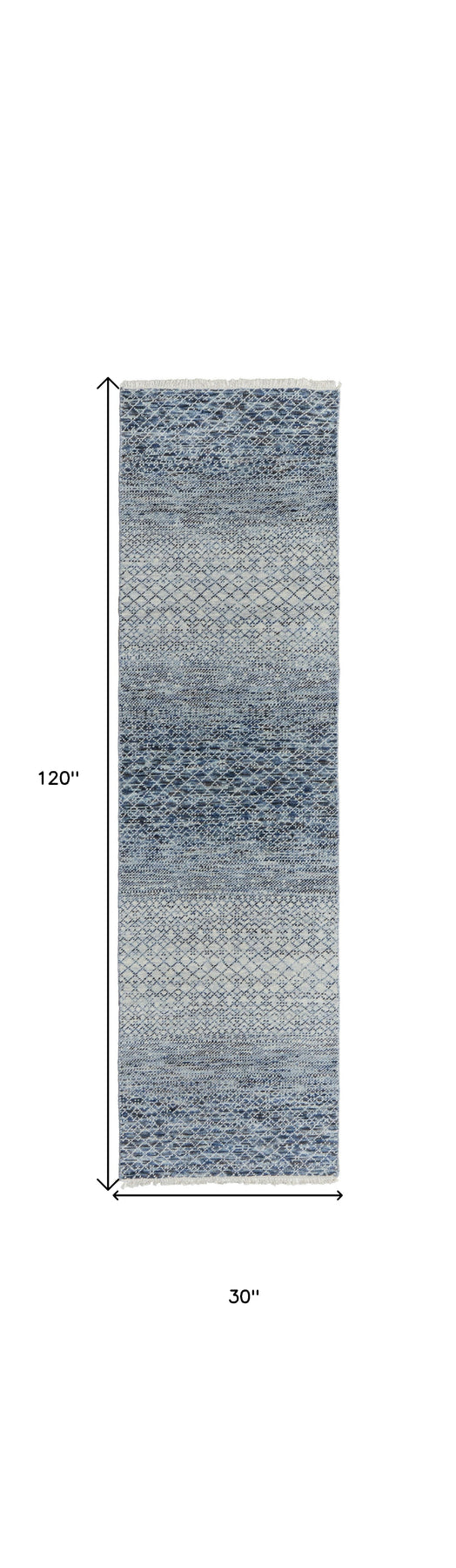 Add some artistry to your room with this 10-foot ivory gray and blue wool hand knotted runner rug with fringe. This runner shaped rug flaunts a ivory gray and blue color that will be a great way to accent your space. Solid colors are versatile and will blend with any existing decor style. Ideal for spaces with kids and pets, this rug is stain resistant to help repel stains and spilled liquids. Tassel ends bring a timeless and fashionable look to your interior. Crafted by skilled artisans, this hand knotted rug is genuine and unique. No two will be exactly alike. Place this area rug against a hardwood or tile floor and it will enliven your living space with style and sophistication. 30-inch H x 120-inch W x 0.35-inch D