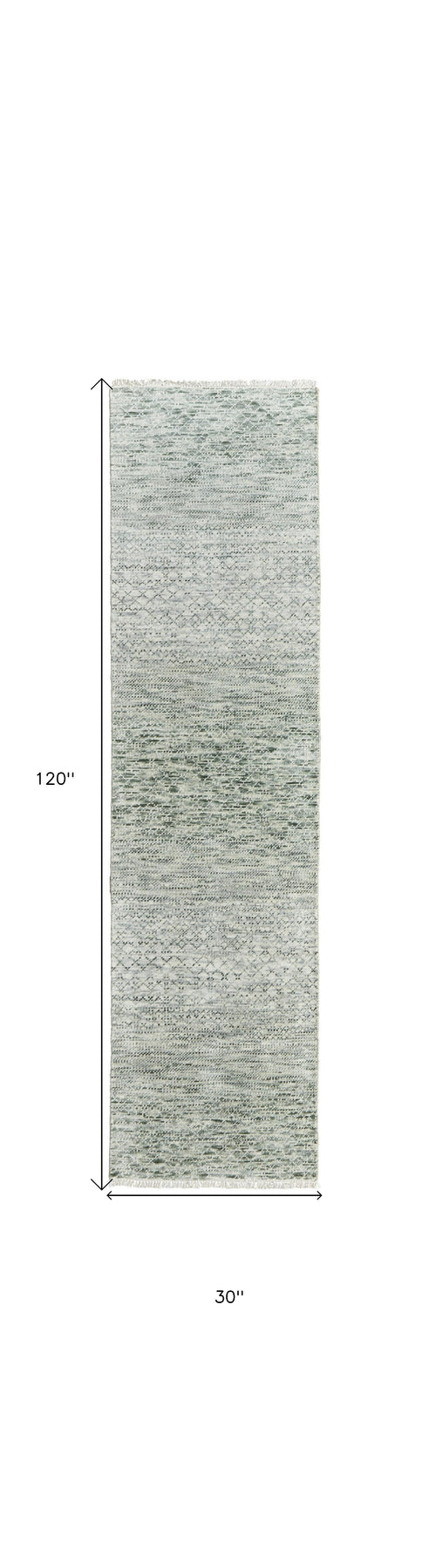This 10-foot ivory and green wool hand knotted runner rug with fringe, is a great way to add warmth to a room. This runner shaped rug flaunts a ivory and green color that will be a great way to accent your space. Solid colors are versatile and will blend with any existing decor style. Ideal for spaces with kids and pets, this rug is stain resistant to help repel stains and spilled liquids. Tassel ends bring a timeless and fashionable look to your interior. Crafted by skilled artisans, this hand knotted rug is genuine and unique. No two will be exactly alike. Area rugs help to give warmth and sense of home to your space. 30-inch H x 120-inch W x 0.35-inch D